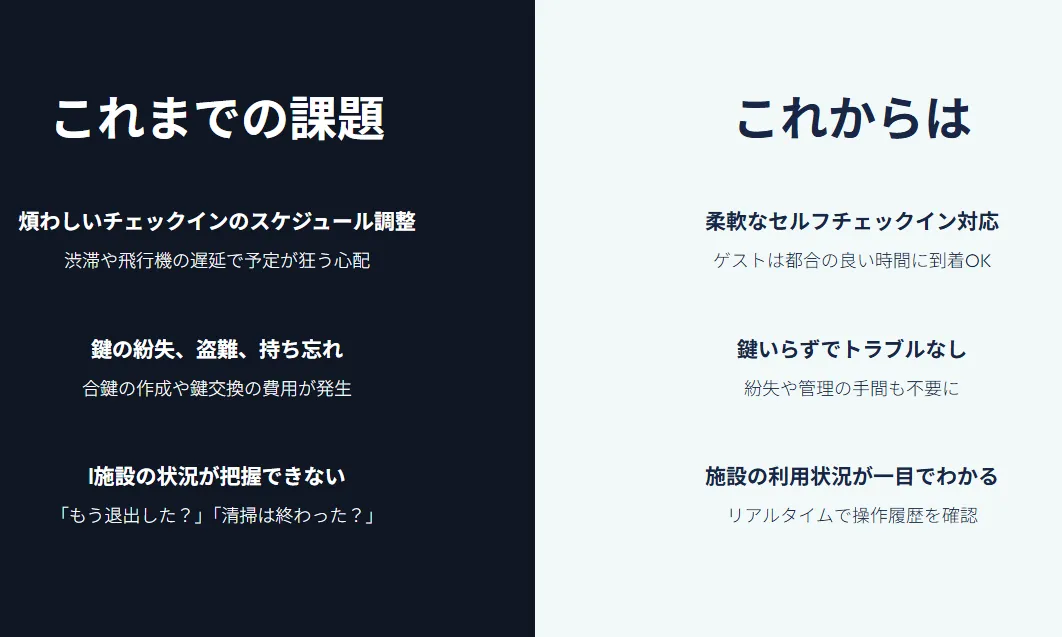 これにより鍵の紛失リスクの低減や運営者の負担軽減だけでなく、宿泊者にとっても快適な体験を提供します。