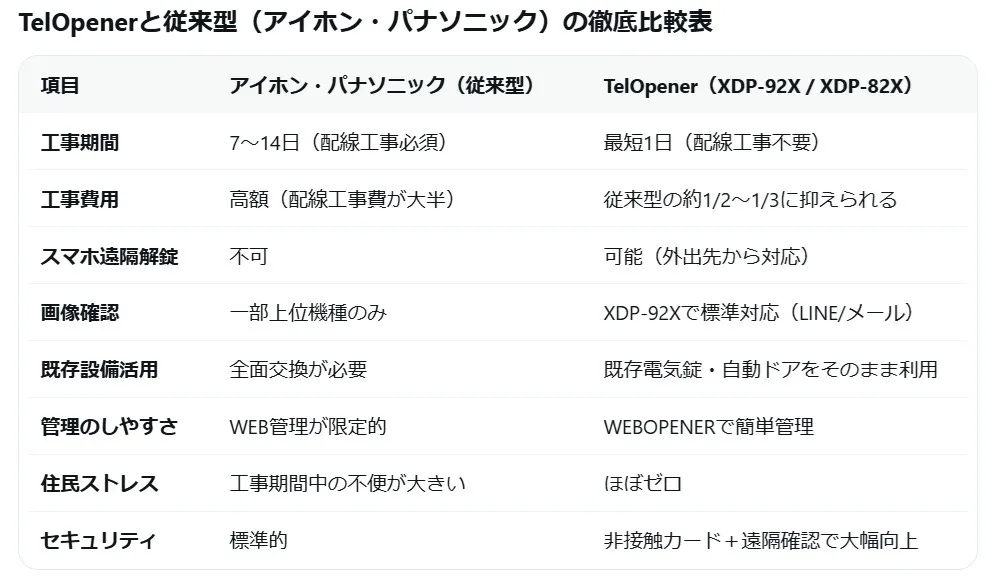 アイホン・パナソニックの従来型システムとTelOpener(XDP-92X / XDP-82X)の違いを実際に施工した経験から徹底比較してお伝えします。