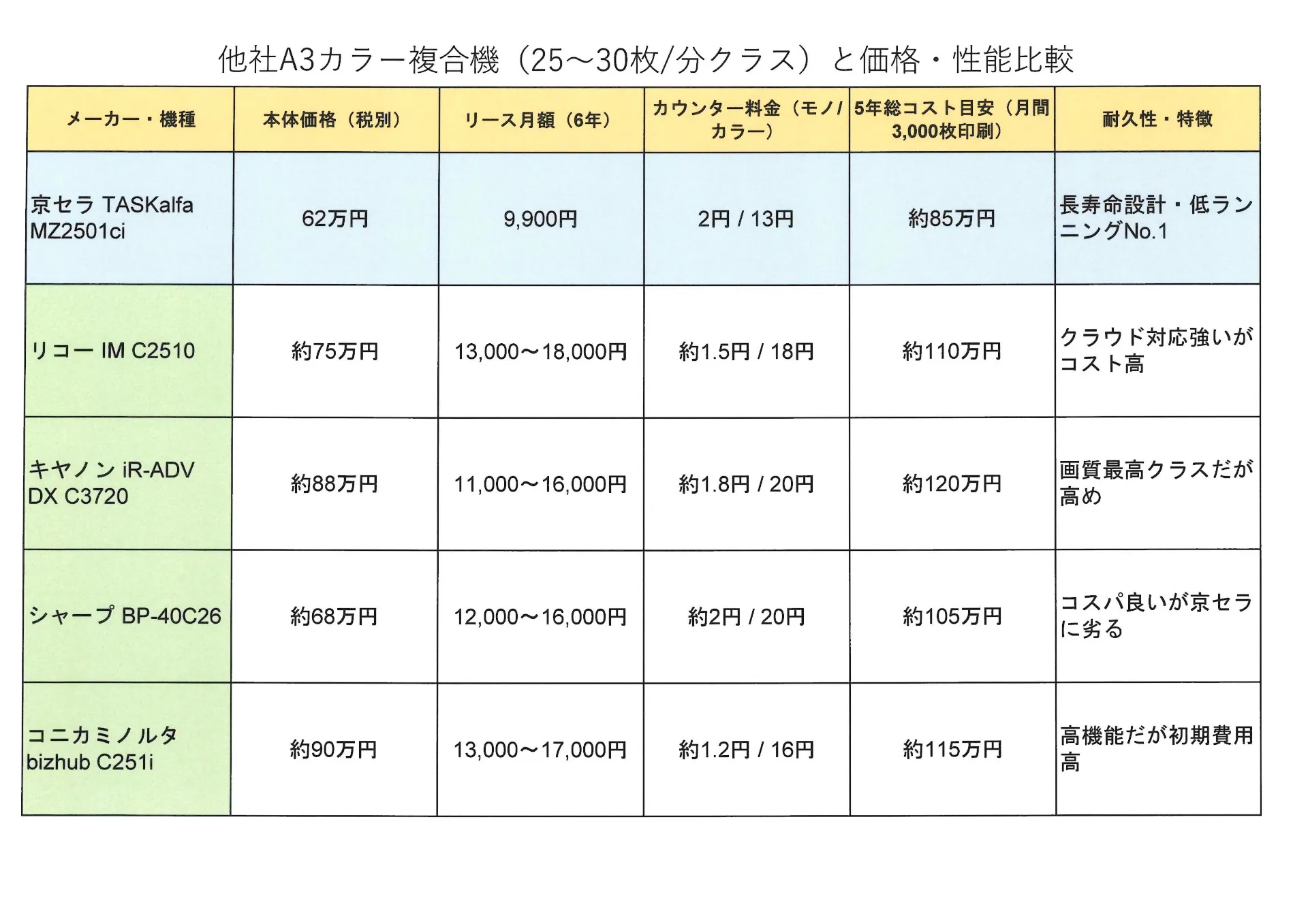 京セラ TASKalfa MZ2501ci vs 他社A3カラー複合機 徹底比較